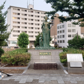 城址公園西側に立つ、天女の像(戦災復興記念像)をときどき掃除しています。 昭和49年に建立されましたが、市民の皆さまには、あまり知られていないようです。 公園で大規模なイベントが開催されると、像の周りは資材置き場となり、心が痛みます。 公園西側入口を整備し、もっと皆様の目に触れる穏やかな場所になるよう、藤井富山市長にお話してあります。 |